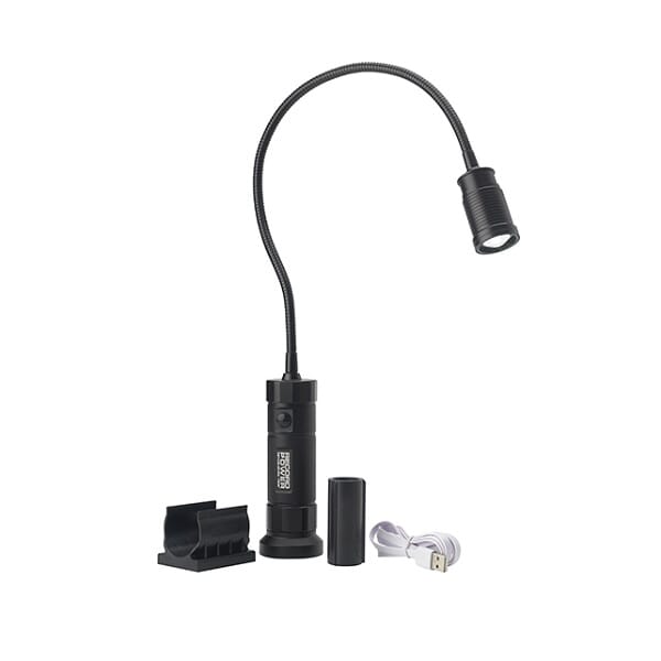 Denne kraftige arbeidslampen er et perfekt tillegg til ethvert verksted. Den lange, fleksible halsen gjør at den kan plasseres for å belyse selv de vanskeligste områdene og fjerne plagsomme skygger, noe som gir et klart bilde av arbeidet som pågår. For å øke lampens fleksibilitet ytterligere, lar en glidende krage på lampehodet enten en spotlight- eller flomlysstråle lages. Den sterke magnetiske basen og magnetiske sideklipsen betyr at lyset kan festes praktisk talt hvor som helst på en maskin. Den kan drives av standard AA-batterier, et oppladbart litiumbatteri eller direkte fra strømnettet via USB-kabelen (ved hjelp av en 5 V, 1 A USB-pluggadapter). Denne lampen gir timer med uavbrutt bruk og er ideell for et bredt utvalg av maskiner som rullesager, båndsager, slipemaskiner, dreiebenker og mange flere.