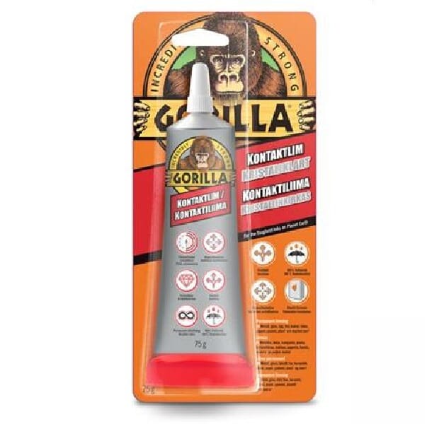 Gorilla Kontaktlim tørker krystallklart, og gjør det til det perfekte, universale limet. Når helt herdet, er det overmalbart og vanntett i den betydning at det kan vaskes i vaskemaskin og tåler regn.