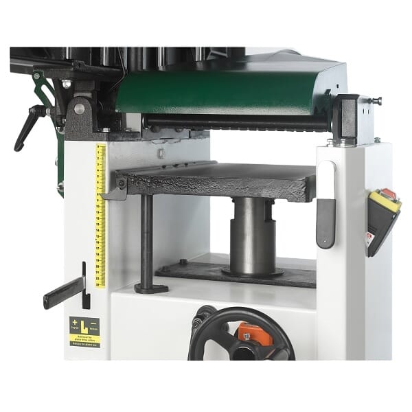 Kuttervalsen har 3 kniver 310mm brede for å sikre en super finish. Utmater valsen er i spesialgummi for å redusere merker ved utmating. Bordet for tykkelseshøvling er montert på en ekstra solid sentrert søyle for å få en presis operasjon og komplett støtte. Høydejustering skjer via et stort, lettbetjent ratt, i enden av maskinen. Bordstillingen kan låses slik at presisjonen opprettholdes under bruk.
