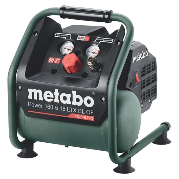 Metabo Power 160-5 18 LTX BL OF er en lett og sterk batteridrevet kompressor med børsteløs motor for bruk til interiørarbeid og på byggeplasser.