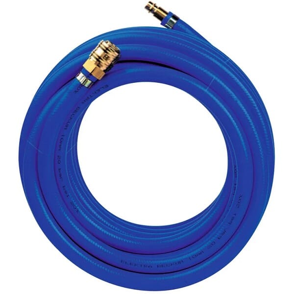 En 10 m lang Metabo trykkluftslange «Superair» med hurtigkobling og nippel.